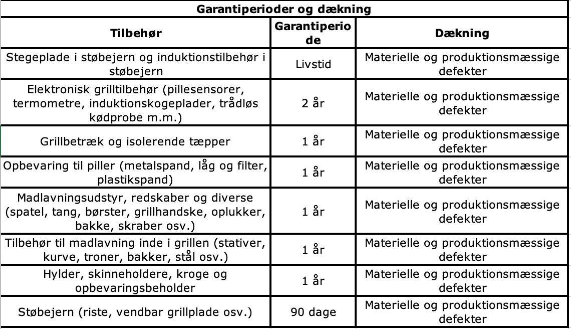 Traeger Pellet Grills Europe ApS, Nelson Mandelas Allé 14, 2. sal, 2450 København SV, Danmark, (‘Traeger’) garanterer tilbehøret i den garantiperiodeog med den dækning, der er angivet i tabellen nedenfor under forudsætning af normal brug og korrekt vedligeholdelse. Denne garanti ydes i tillæg til dine rettigheder som køber i henhold til lovgivningen i dit bopælsland og fratager dig ikke den beskyttelse, som lovgivningen i dit bopælsland giver dig. De pågældende garantiperioder starter på datoen for afslutningen af den originale købskontrakt fra en autoriseret forhandler af Traeger og er gyldig for kunder i Europa. En liste over autoriserede Traeger-forhandlere er til rådighed på https://www.traeger.com/dealers (hver især en “Authorized Seller”). Garantiperioden og dækningen for dine Traeger Accessories er som følger: