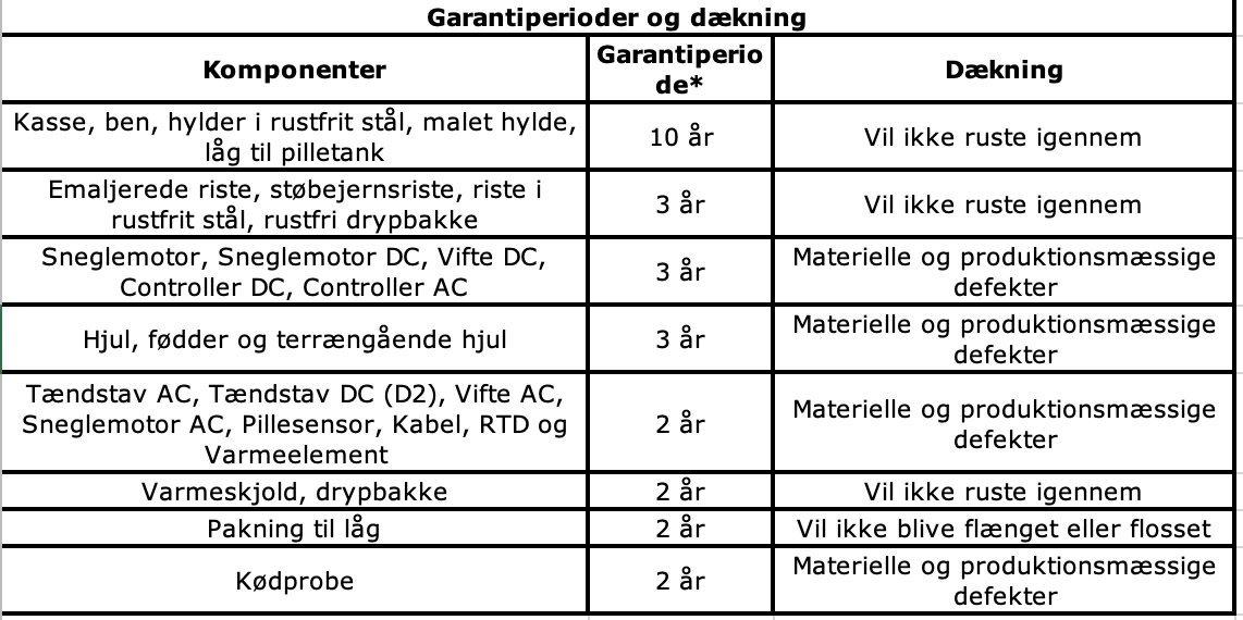 Traeger Pellet Grills Europe ApS, Nelson Mandelas Allé 14, 2. sal, 2450 København SV, Danmark, (‘Traeger’) garanterer denne Traeger Grill for komponenterne, dækning og garantiperiode er opregnet i tabellen nedenfor under forudsætning af normal brug og korrekt vedligeholdelse. Denne garanti gives som tilføjelse til dine rettigheder som køber i henhold til lovene i dit bopælsland og fratager dig ikke den beskyttelse, som du tildeles af lovene af dit bopælsland. De pågældende garantiperioder starter på datoen for indgåelsen af den originale købskontrakt med en autoriseret forhandler af Traeger og er gyldig for kunder i Europa. En liste over autoriserede Traeger-forhandlere er til rådighed på https://www.traeger.com/dealers (hver især en “Authorized Seller”). Garantiperioden og dækningen for erstatningsdelene er som følger: