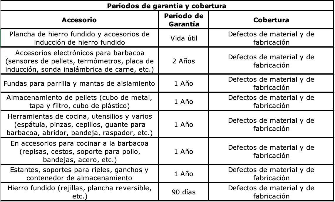 Traeger Pellet Grills Europe ApS, Kattegatvej 40, 2150 Copenhague, Dinamarca, ("Traeger") garantiza los accesorios por el período de garantía y la cobertura enumerada en la tabla a continuación bajo uso normal y mantenimiento adecuado. Esta garantía se otorga además de tus derechos como comprador según las leyes de tu país de residencia y no te priva de la protección que te brindan las leyes de tu país de residencia. El período de garantía respectivo comienza a partir de la fecha de celebración del contrato de compra original con un distribuidor autorizado de Traeger y se otorga a los clientes en Europa. Una lista de los distribuidores autorizados de Traeger está disponible en https://www.traeger.com/es/es/localizador-de-distribuidores (todos son "Vendedor autorizado"). El período de garantía y la cobertura para tus accesorios de Traegerserán los siguientes: