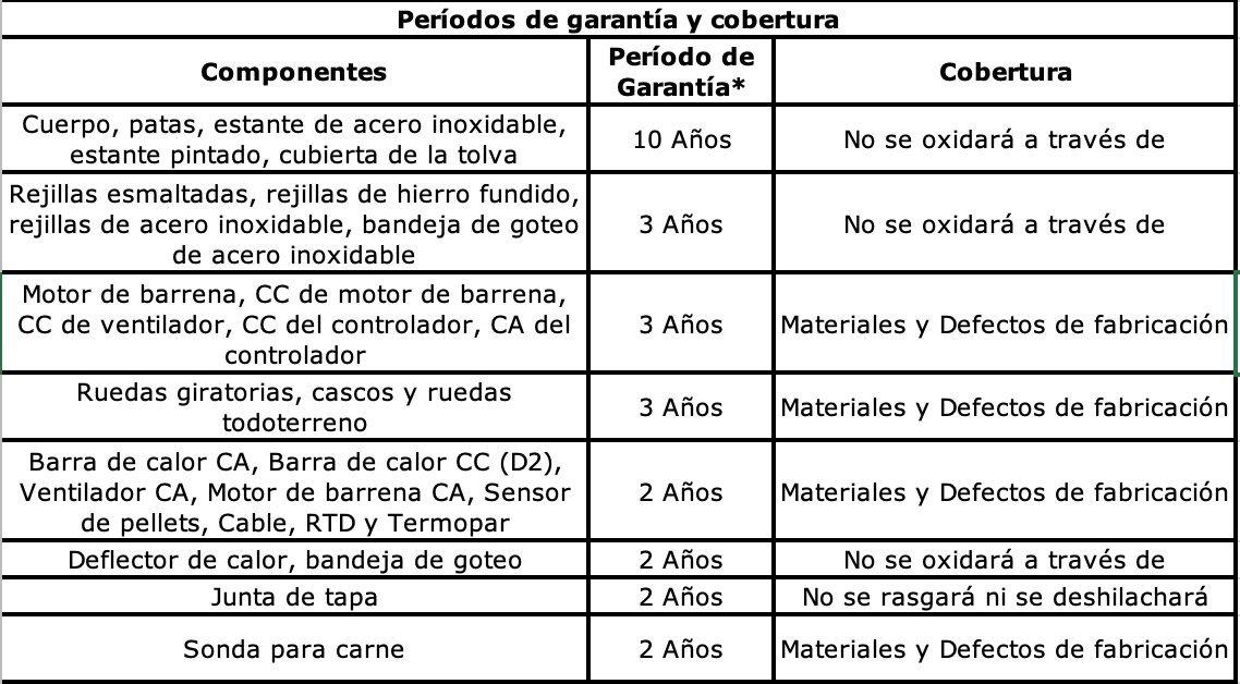 Traeger Pellet Grills Europe ApS, Kattegatvej 40, 2150 Copenhague, Dinamarca, ("Traeger") garantiza esta barbacoa Traeger por los componentes, la cobertura y el período de garantía que se enumeran en la tabla a continuación bajo uso normal y mantenimiento adecuado. Esta garantía se otorga además de tus derechos como comprador según las leyes de tu país de residencia y no te priva de la protección que te brindan las leyes de tu país de residencia. El período de garantía respectivo comienza a partir de la fecha de celebración del contrato de compra original con un distribuidor autorizado de Traeger y se otorga a los clientes en Europa. Una lista de los distribuidores autorizados de Traeger está disponible en https://www.traeger.com/es/es/localizador-de-distribuidores (todos son "Vendedor autorizado"). El período de garantía y la cobertura de las partes de repuesto serán los siguientes: