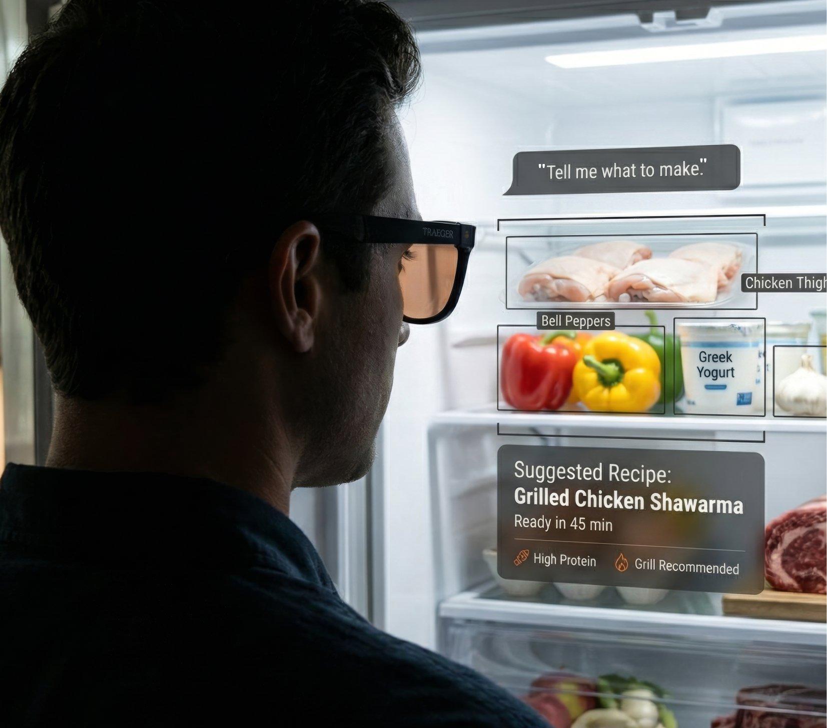 Our MEAT‑AI glasses scan your fridge and pantry to recommend the perfect Traeger‑approved recipe based on the ingredients you have on hand.